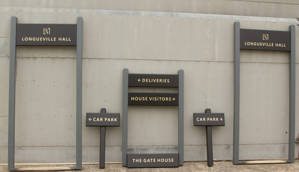 Our manager, Poppy, recalled a specific set of estate signs (pictured below). This three-colour estate sign set has an incredibly smart appearance and makes a fantastic collection. With grey posts, black centres and golden lettering, the professionalism of these pieces, enhanced by our quality craftsmanship, makes these pieces worth remembering! Although Pop thankfully picked a set of signage that perfectly displays some of her handy paintwork, we thought we would note that she is a fan of many other types of signage too!